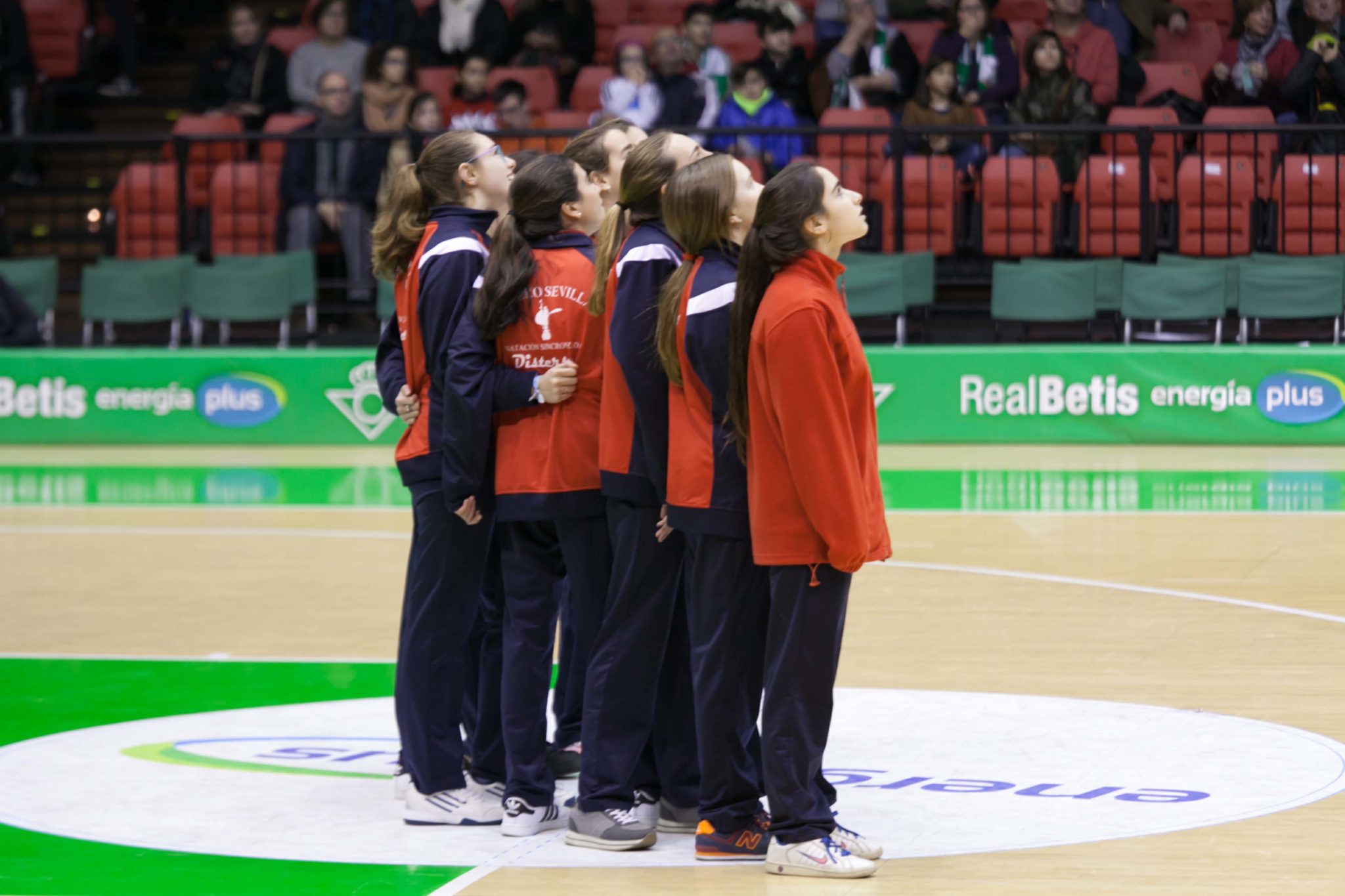 Durante el último partido del Real Betis Energía Plus en el que se enfrentaba al F.C Barcelona Lassa nuestras chicas saltaron al campo durante el descanso con el fin de representar al club. Mientras tanto, se proyectaba un vídeo (podéis verlo pinchando aquí) donde se mostraban a nuestras sirenas durante sus entrenamientos y rutinas. Además, nuestras nadadoras estuvieron repartiendo folletos con información del club entre los aficionados que presenciaron el partido.