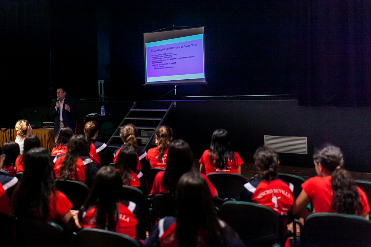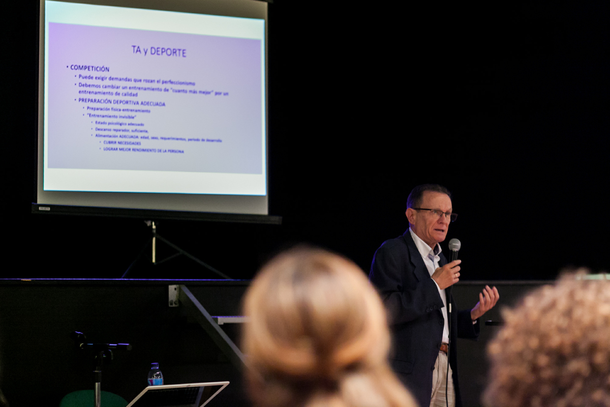 Nos hizo saber cada uno de los factores que influyen: el entorno familiar, entrenadoras, compañeras, el colegio… advirtiendo de los hechos ya estudiados y comprobados que suelen llevar a padecer este TA.